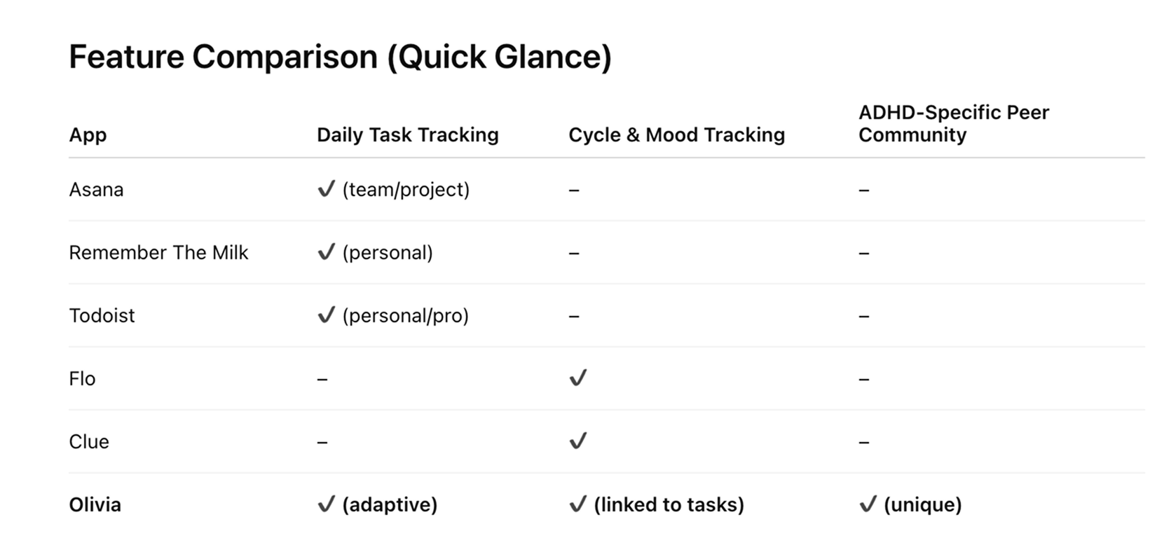 Unlike most productivity apps that focus only on task completion, Olivia bridges the gap between productivity and emotional well-being designed especially for women with ADHD.