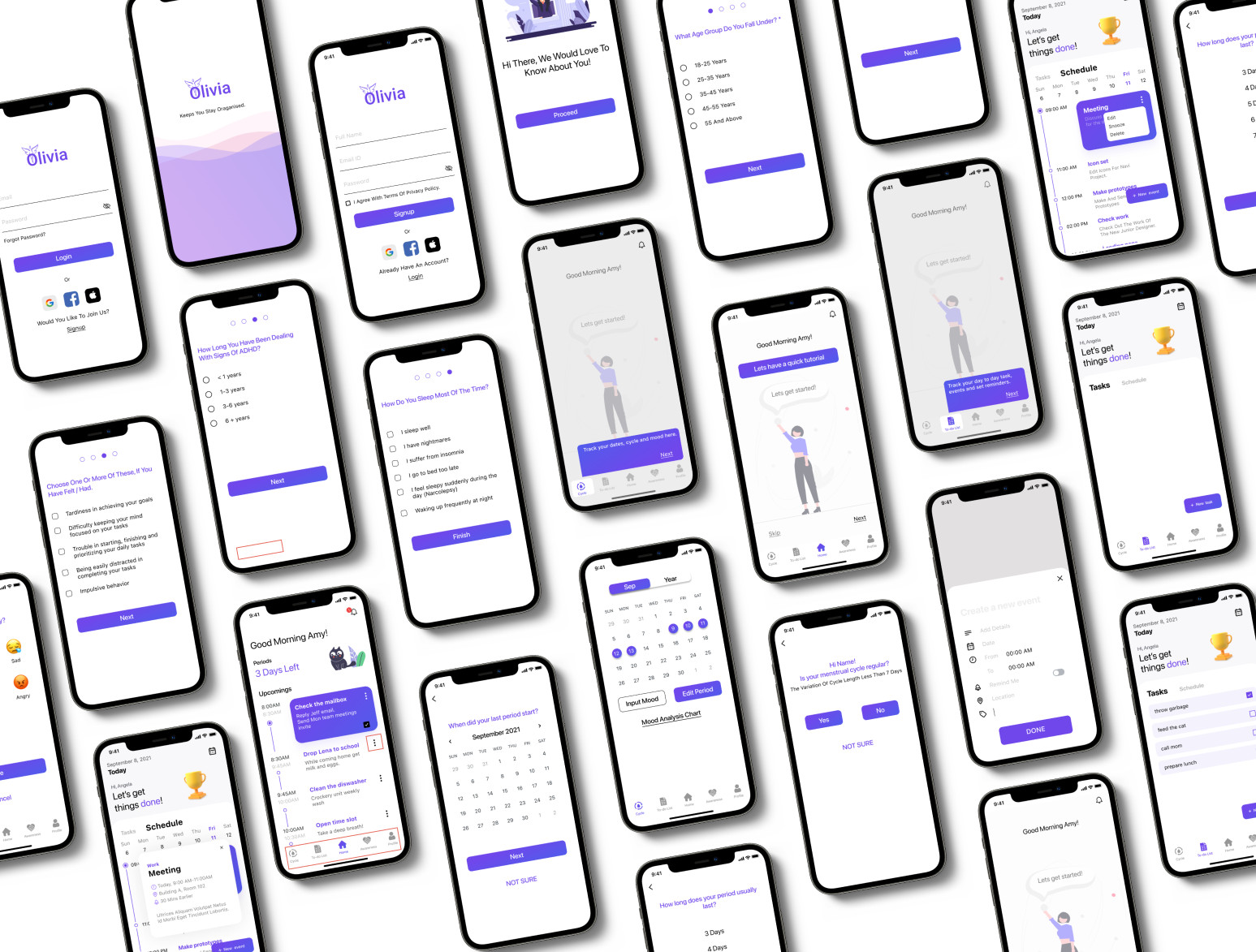 I helped shape "Olivia" from concept to product by translating user research & emotional insights into a supportive app experience that empowers women with ADHD to plan, track, and connect.