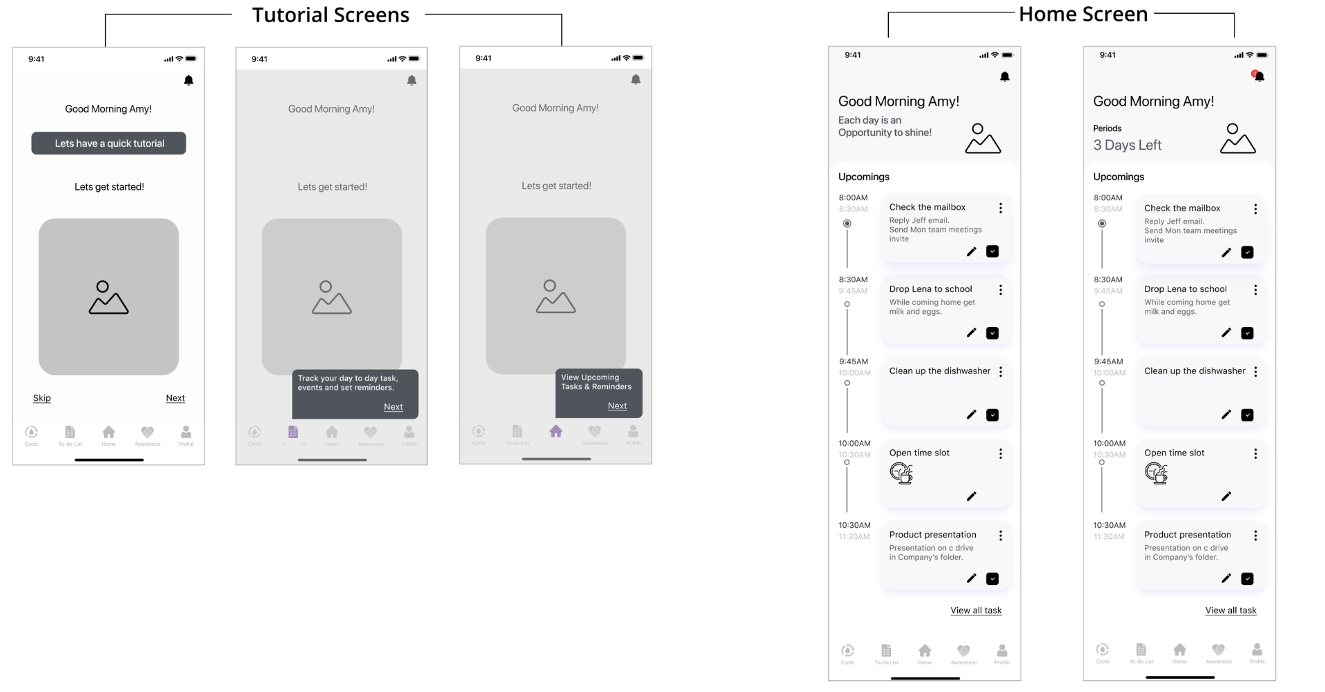 - On the Dashboard, users can see upcoming tasks alongside the number of days left until their next cycle, helping them stay informed and balanced.