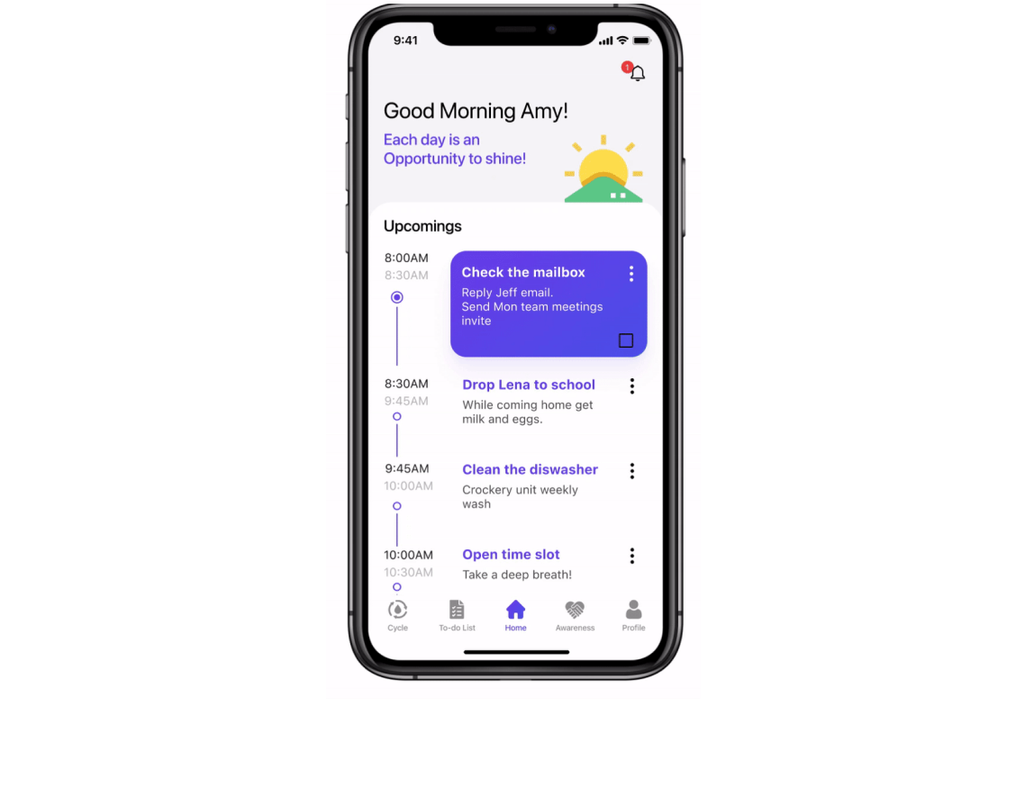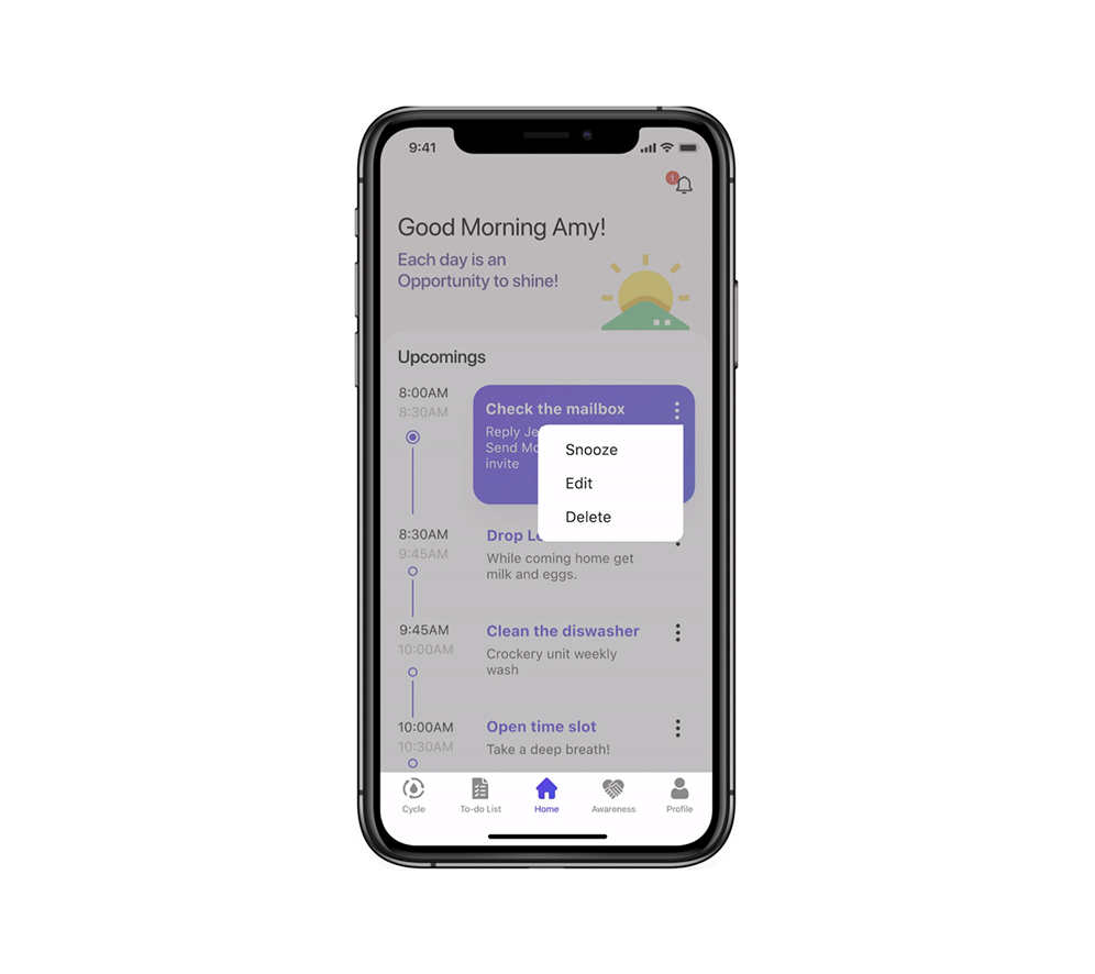- Each task includes a time duration and a snooze option for reminders, allowing users to manage their day without stress.